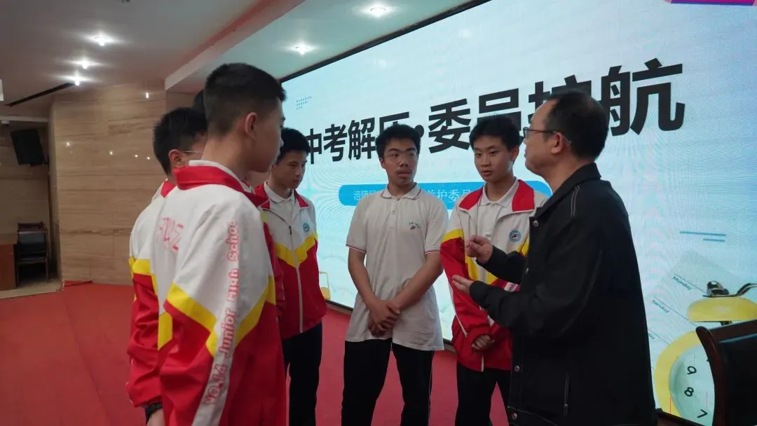 活动以“传递电流”游戏开场,政协委员们与同学们手叠手,在协作中传递“电流”,欢声笑语中,同学们不仅释放了压力,更悟出了团队协作与高效沟通的真谛。戴羊委员与学生亲切交流,引导同学们学会接纳情绪、转化压力,鼓励他们道:“中考是成长的一站,而非终点,你们的努力早已在每一步脚印里熠熠生辉。”