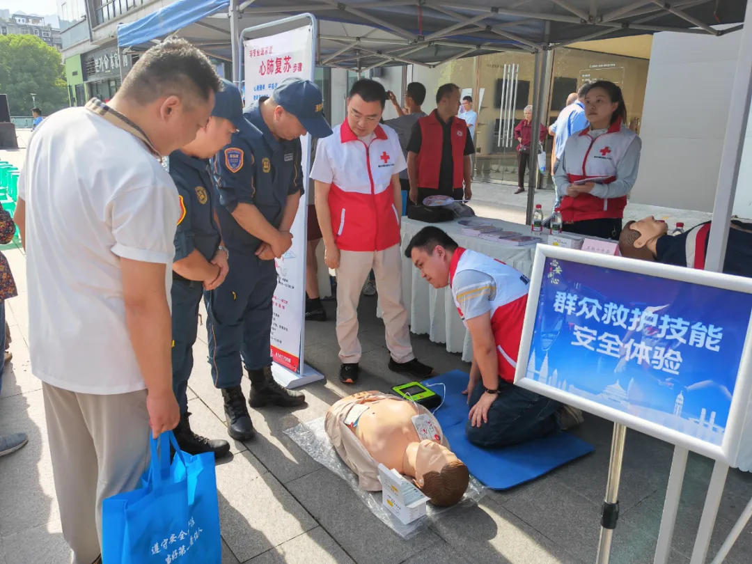 活动现场设置了多个互动体验区与教学展位。在应急救护教学区,红十字会应急救护师资通过模拟情景,向市民示范了海姆立克急救法和心肺复苏术(CPR+AED)的操作要点,强调胸外按压需“两臂伸直、掌根重叠、垂直下压,深度至少5厘米至6厘米”的技术规范,参与者通过人体模型实操练习,掌握了急救关键步骤。本次活动还通过发放红十字应急救护知识手册、开展安全知识问答等形式,向市民普及交通安全、生产安全及家庭急救常识。