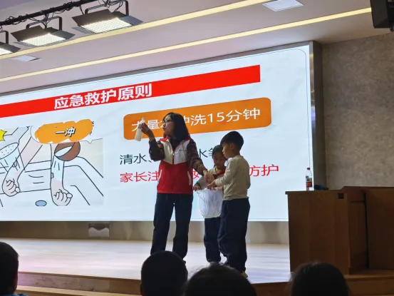 培训伊始,应急救护师资们通过讲述红十字运动的起源,将人道主义的种子播撒在孩子们心中。随后,他们结合学生实际情况,运用场景模拟、互动教学等多样化形式,详细讲解了气道异物梗阻、犬咬伤、烧烫伤等常见急救技能。在课堂上,学生们听得津津有味,不时举手提问,现场气氛十分热烈。