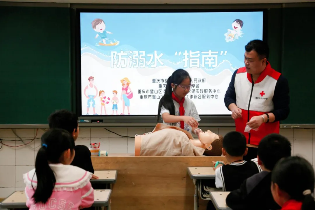 璧山区红十字会联合河边镇人民政府及相关单位,在河边镇小学开展了防溺水指南暨青少年应急救护技能普及活动。