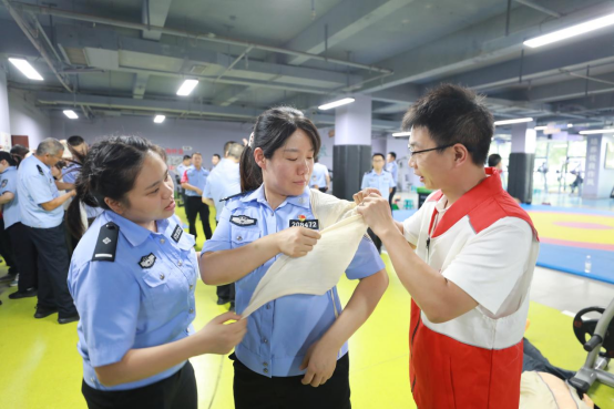 培训现场,红十字会讲师通过模拟人教具演示心肺复苏操作流程,强调“黄金4分钟”的重要性,并指导学员分组练习,确保动作规范、力度到位。在创伤包扎环节,学员们学习了止血带使用、骨折固定等技能,公安干警结合职业特点,针对性学习了现场急救与警务协作的结合应用。